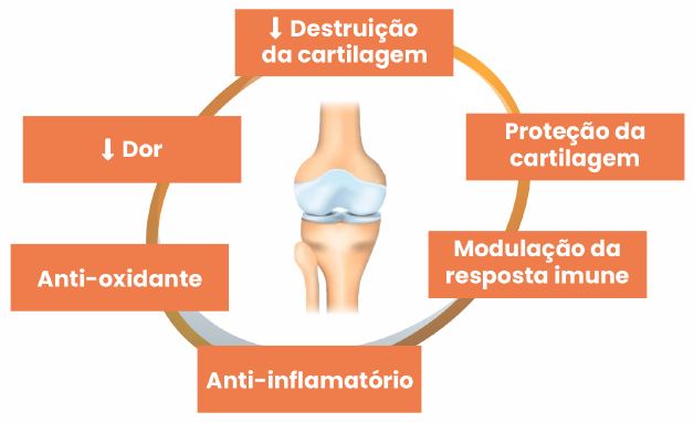 Cloridrato de Glucosamina, Sulfato de Condroitina, Mitidol® (combinação patenteada de extracto de Zingiber officinale e Acmella olerácea), MSM, Colagénio Tipo II, Cavacurmin® (complexo de curcumina), Harpago, Boswellia, Manganês, Zinco, Óleo de peixe (EPA e DHA), Vitamina E, Vitamina C